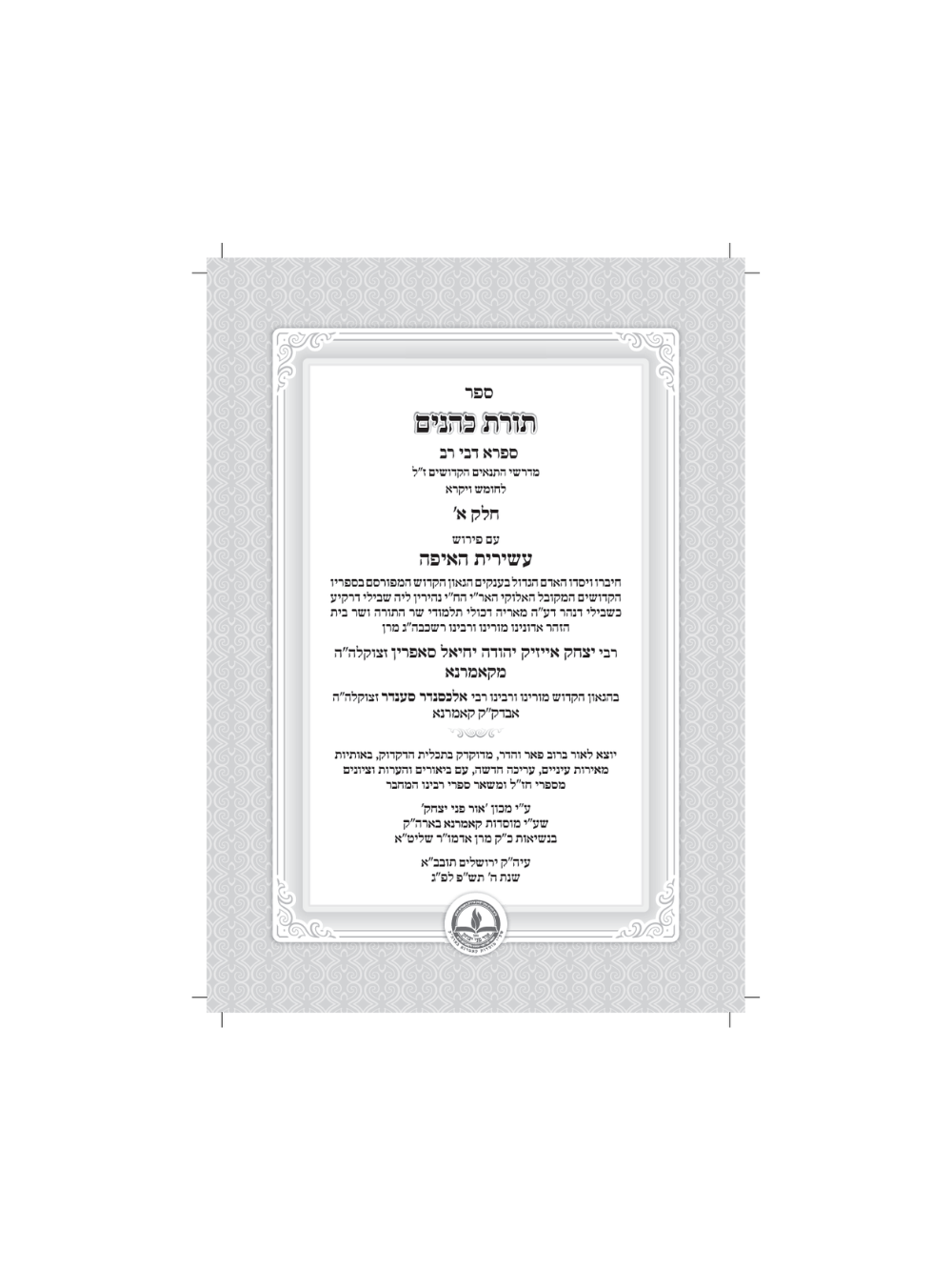 תורת כהנים -ע''פ עשירית האיפה -קאמרנא -ב''כ